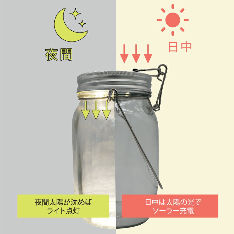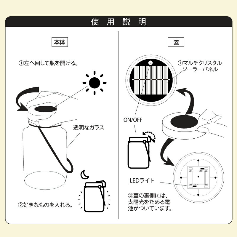 太陽光とLEDで優しく光る瓶型ソーラーLEDライト 昼間に太陽光で充電! 瓶の蓋に内蔵されたソーラーパネルが内蔵電池を充電します。